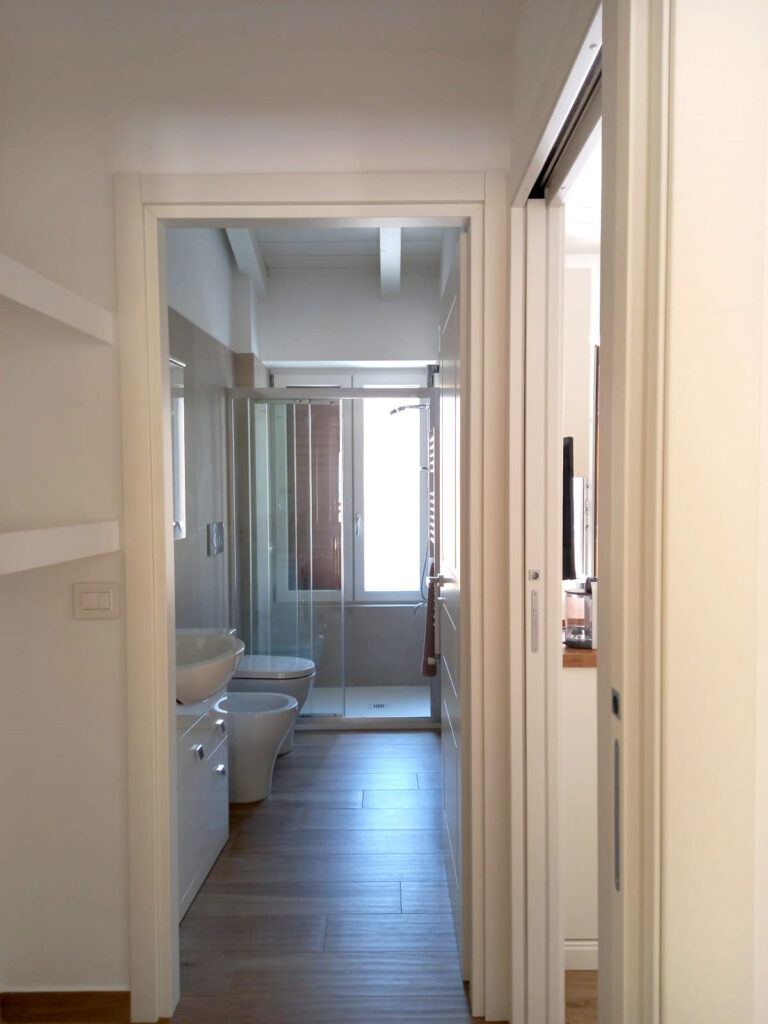 Il bagno dell’Appartamento 2 è arredato con gusto, dotato di una spaziosa doccia e accessori di alta qualità, compreso un asciugacapelli. Il design curato e i materiali di pregio assicurano un’esperienza di relax e benessere.