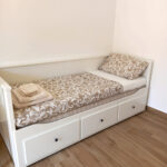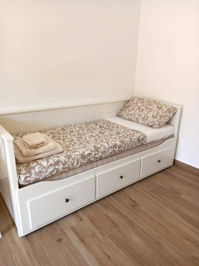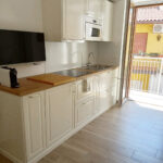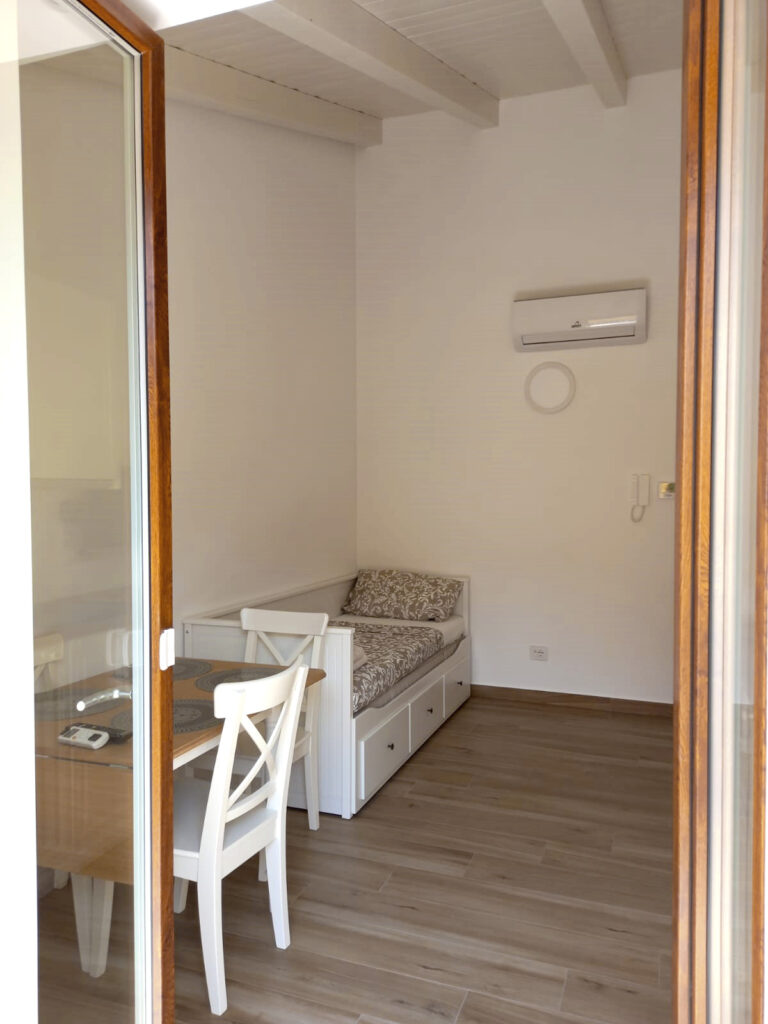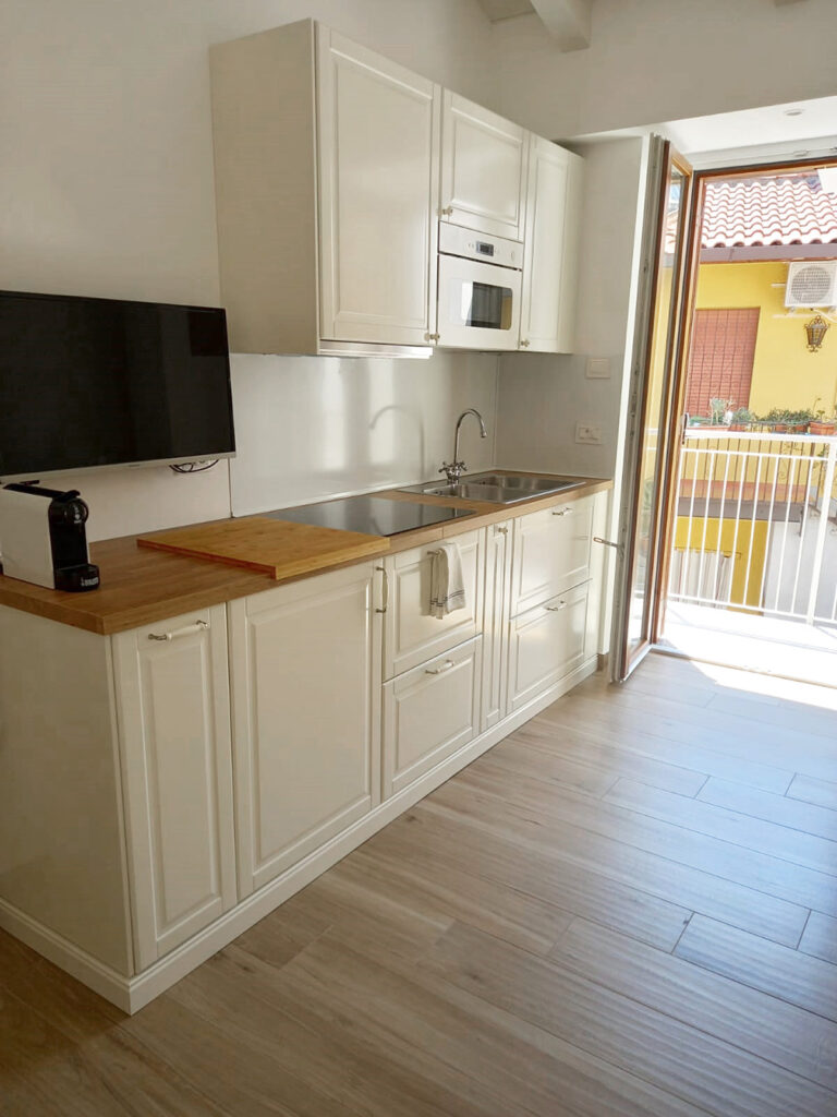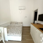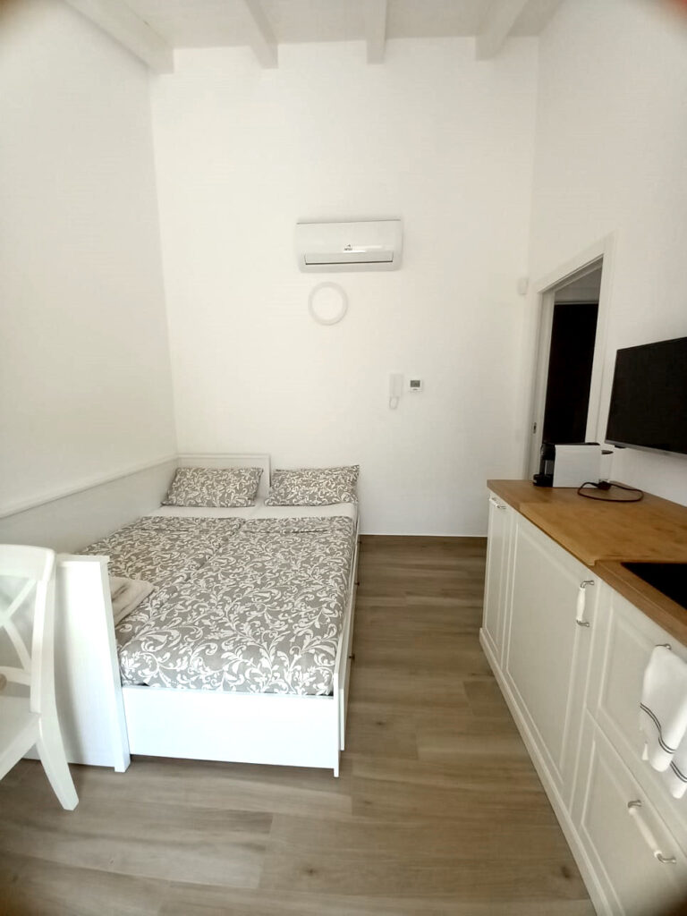 Il salotto dell’Appartamento 2 è dotato di un divano letto a 2 posti, che offre ulteriore spazio per gli ospiti. L’angolo cottura, moderno e ben equipaggiato, permette di preparare i pasti con facilità. Anche qui, una TV widescreen e un condizionatore garantiscono il massimo comfort durante il soggiorno.